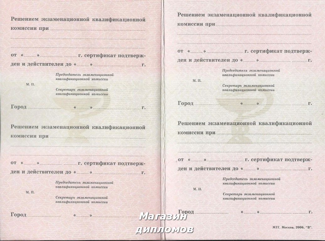 Медицинский сертификат Российской Федерации (Гознак, МТГ Москва 2006 год), выдавался с 2006 года по 2012 год.